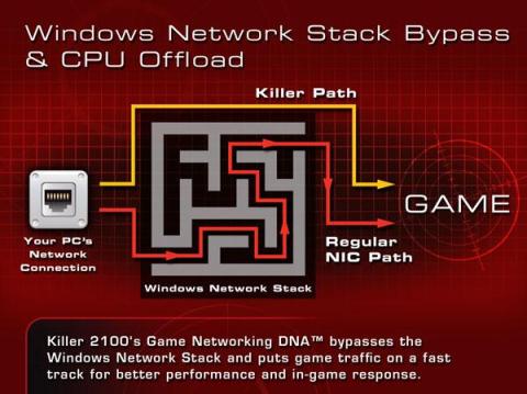 Killer NICは、従来CPUが受け持っていたネットワーク処理(特にオンラインゲームの少量のパケット通信)をハードウェア処理することでフレームレートを改善、さらにWindowsの一般的なネットワーク経路をバイパスする事で、レイテンシを改善するというものです。
