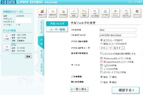 DLNAの共有フォルダを決める事が出来るため、DLNAプレーヤーで不要なファイルを検出させない事が可能。
