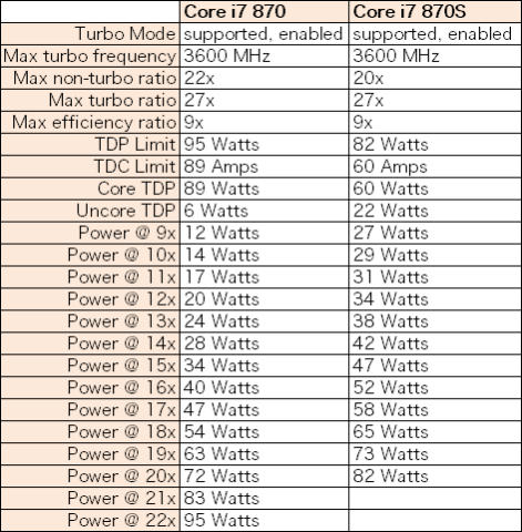 このパラメータを見ると、TDPの限界値は870が95W、870Sが82W、電流量の限界値が870が89アンペア、870Sが60アンペア、1コアあたりのTDPの限界値が870が89W、870Sが60W、コアが非動作として認識する為に指定された電力は、870で6W、870Sで22W、そして、次の段階に進むために必要な電力がそれ以降に記されているのだが、全く違うパラメータが設定されているのが良くわかる。
