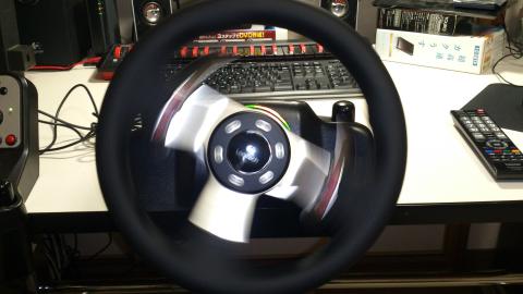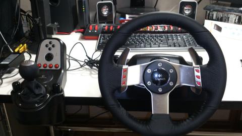 本製品と同じくLogitech製900°ステアリングのDrivingForceGTの購入も検討していましたが、6速マニュアルシフターの存在と本革ステアリング、本格的なパドルに惹かれてしまいました。