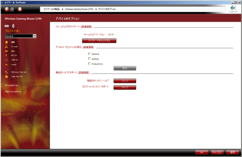 デバイスのオプションの項目ではファームウェアのアップデートやデフォルトプロファイルの復元などが出来る。