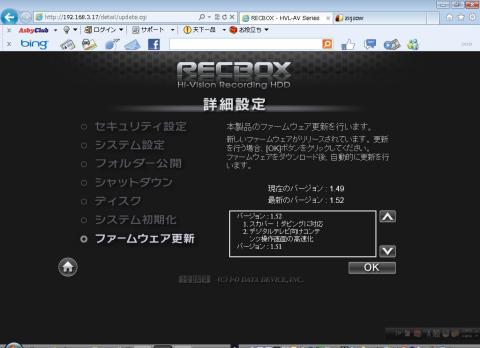 HVL-AV1.0本体前面の更新ランプが点灯しているのに気付いた。操作画面で確認したら、確かにバージョン1.52がリリースされたので、早速更新した。