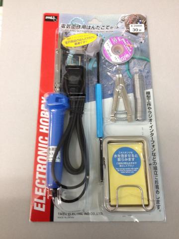 ニクロムヒーター型はんだごてに、電子工作に必要な各種アクセサリーがセットになった商品です。