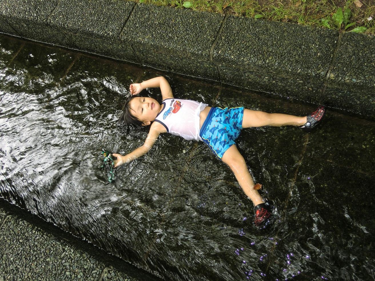 自宅近くの公園に行く時も地獄兄を手放さず、一緒に水遊び。