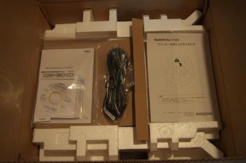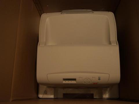 梱包材をしまって、空箱の上にのせたカラーレーザープリンタです。