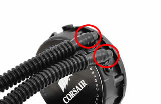 Corsairのロゴが水平に来る様にポンプ部を固定すると、H70の奥側のホースの付け根が90度近く折れ曲がってしまいます。