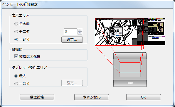 しかしワイド画面全盛のこのご時勢、スクエア時代のタブレットであるFAVOは本体と画面のアスペクト比ズレを許容して入力範囲を広く取るか、一部の範囲を犠牲にしてアスペクト比を維持するかの二択になる。私の場合アスペクト比がずれると違和感が出るので入力範囲の一部を殺して比率を維持してるが、こうなると入力範囲の面積は後継のBAMBOOに対してかなり劣る。