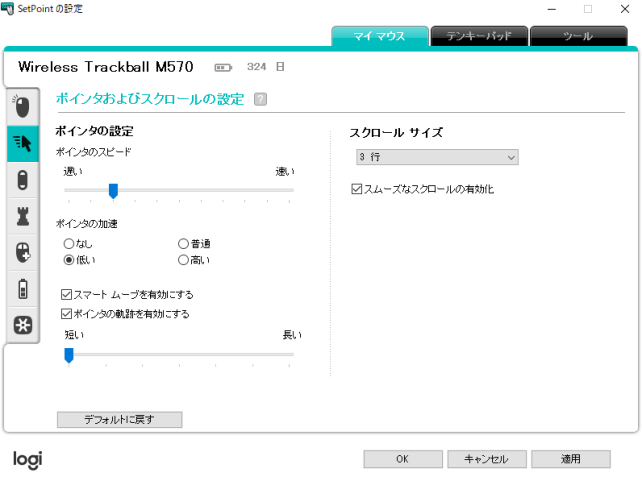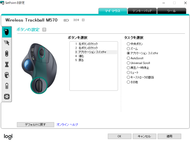 スクロールのボタンはアプリケーションスイッチャーにあてて、サイドボタンはブラウジングの戻ると進むに当てました。マウスのポインタのスピードは遅めに設定しました。理由は、PhotoShopやLightroomのパロメータ操作がしやすいからです。