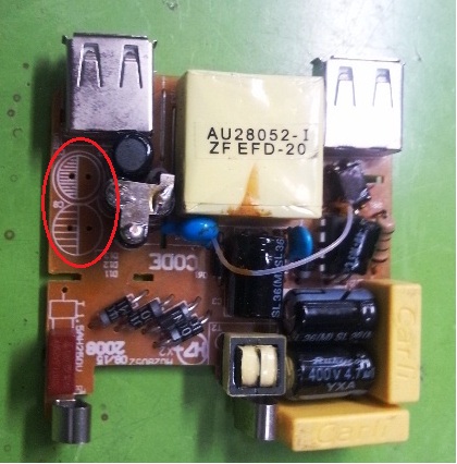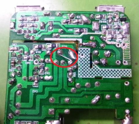 調べてみたら赤丸部分のパターン切れ(修復済み)と下記コンデンサの破損(ショートモード)でした。