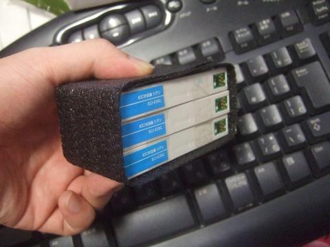 背面側はもっと凸凹が激しいので、使い切ったプリンタインクに滑り止めゴムを巻いて台をつくります!