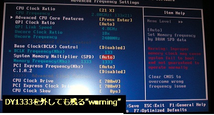 約7か月前にCPU:i7_860、M/B:GA-P55UD3のセット販売で購入、IO新品ワケ有りメモリDY1333-2Gが送料を含めても超安く、通常はM/Bの対応メモリを調べるのだが、逆にメモリが対応しているM/Bを調べたところ、本M/Bに一致はしなかったものの、GA-P55-UD4、UD5が対応していたため、買いました。BIOSにメモリー関係部分に”warning”があり、念のためW3U1333_2G*2も追加し、MEMtest86でも特に問題もなくWin7/WinXPがメモリ8GBで動作していました。今回、地デジキャプチャGV-MVP/HZ2W購入の前にio-dataの『地デジ相性チェッカー』をかけるとメモリのみ”×”-2GBという判定でした。昨年来気になっていたDY1333-2Gを2枚ともはずしW3U1333*2にて『地デジ相性チェッカー』をかけると、みごと3項目とも二重丸になり無事GV-MVP/HZ2Wのインストールを終えネットブックと大きく異なり、スムースに動いて『ほっ』としています。パーツ規格の種類が増えて【相性問題】がますます難しくなってきました。今後しっかりとパーツの相性を調査してから組み立てに臨みたいと思いました。