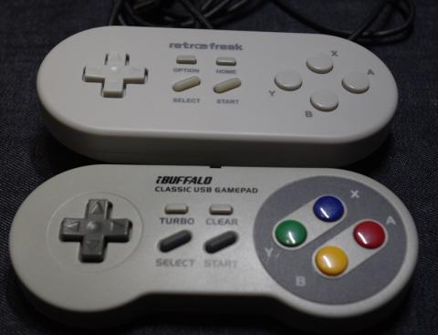レトロフリークのコントローラは平らなのですが、スーファミ風の方は手前から奥に行くにしたがって厚みが出るようにカーブを描いています。