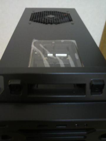 もう3㎝でいいから奥行きが欲しかったですね。マザーとHDDとの隙間が少ないんで、ご覧の通りSATAケーブルが団子のようになってます。というより、最近のケースで多い、HDDを横向きにしてくれたら良かったですね。