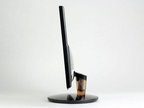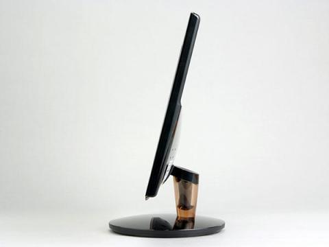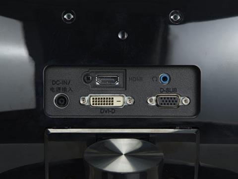 背面にはD-Sub、DVI-D(HDCP対応)、HDMIの映像入力端子が並ぶ。スピーカーは内蔵していないが、HDMIの音声を出力するステレオミニのヘッドフォン端子は用意している。また、電源ユニットも内蔵しておらず、ACアダプタを利用