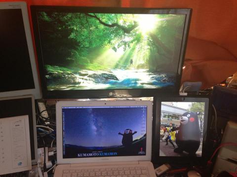 Power book G4のディスプレイをIPS 226Vとデュアルディスプレイ化させて、mac bookで画面共有させたものをiPS 226Vに映してみました。複数のmacを同時に使った作業でもいちいち入力切替せずに楽に対応出来そうです