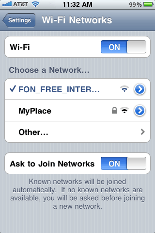 暗号化されていて、そのfonルーターのオーナーだけが、5つまでのデバイスに使用を許可する事が出来ます。自分のfonルーターに、自分のiPhoneを 1台、あと4台までのiPhone、iPod、PC、DS、PSPなどに、自分で使用を許可する設定をして使う事が出来ます。この電波は暗号化されているので、自分のfonルーターの「My Place」電波だけが使用できます。自分のfonルーターの「My Place」は使えますが、他人のfonルーターの「My Place」には接続出来ません。