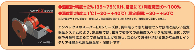 温湿度計って沢山あるけど、どこのを買ってもまず温度は似たり寄ったりという事です。問題は湿度計の精度だそうです。本器の精度は±2%。他機種はデジタル表示だろうがカッコよくても精度±5%とかあるので最大10%の誤差表示という事から信用も微妙です。本器は最大4%の誤差なのでより正確ということですね。すごいぞスーパーEX。