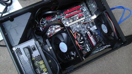 組み込んだ中の様子、内蔵FANが3種類あるので、結構音はします。はずしても問題はありませんが、構造上、上部1つは必要だと思います。