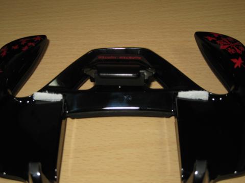 同時に購入したユクモレッドには付属していたので本体形状を確認してみると、改良モデルなのか自分の情報確認時の見間違いなのかフックの3箇所にラバーフットが貼られていました。上のフック部分についてはこの仕様なら傷も付きにくいと思います。しかし下のフックの部分はユクモレッドと同様に一部にのみラバーフットが取り付けられているだけですのでPSPロゴ付近に傷が付くかもしれません。