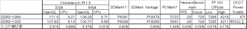 メモリクロックは一般的な1333Mhとメモリの定格クロックである1866Mhzで測定した。