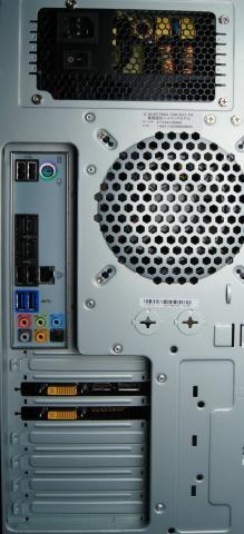 背面にはUSB3.0とUSB2.0、そしてサウンド、DVI、HDMI、Displayportが並ぶ。マザーボードにはUSB2.0用の使用されていないピンが用意されているため、外だしようのケーブルブラケットを用意すれば、さらにUSB2.0を増設することも可能だ。