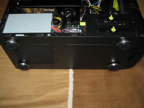 インシュレーターはプラスチック製。電源の下の部分に吸気口が設けてあるのですが搭載されている電源と穴の位置が3cmほどずれているためか電源はケース内吸気でセットされています。