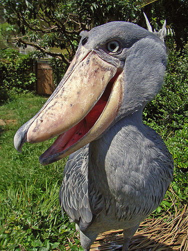 がーっと口を開いて威嚇するハシビロコウさん