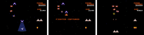 捕獲された自機を破壊してしまったときのやるせなさは何とも言えません。ファミコンであればリセットで済みますが、アーケードだとお金を使っていますので尚更……。
