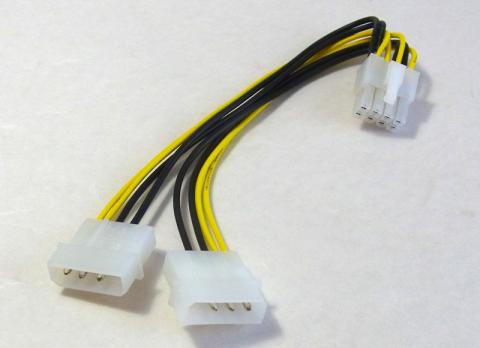 ペリフェラル4pin2つをATX12V8pinに変換するケーブル。元々はそのコネクタが無い古い電源を流用したりするためのケーブルと思われる。