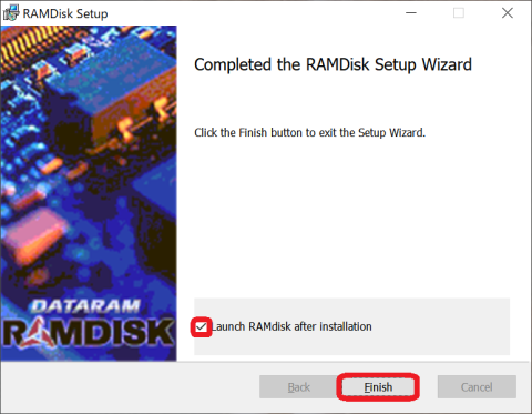 Launch RAMDisk after instllation にチェックを入れてFinish。