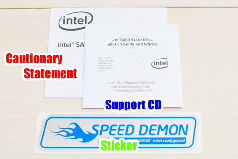 上側から、注意書き×1、サポートCD×1、ステッカー×1が同梱されています。