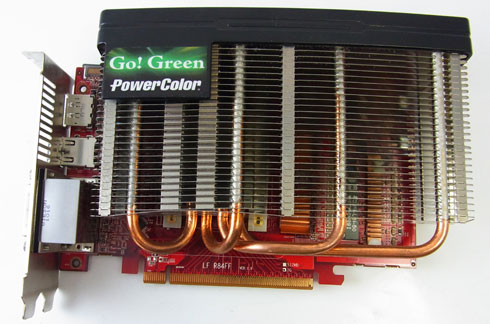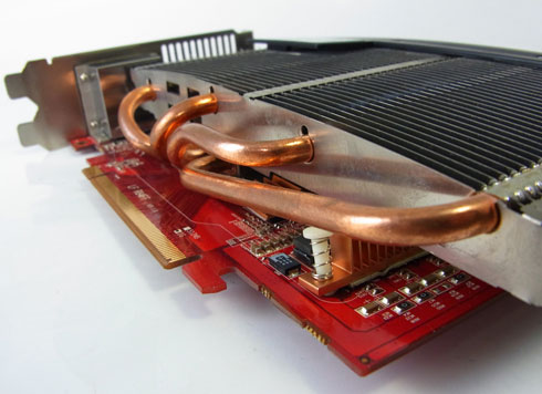 本来ファンレス運用は考慮されていないHD5750をファンレス化しただけあって、そのヒートシンクは大きく、4本のヒートパイプによって保持されている。まるで第二次大戦時代の航空母艦のような威圧感だ。