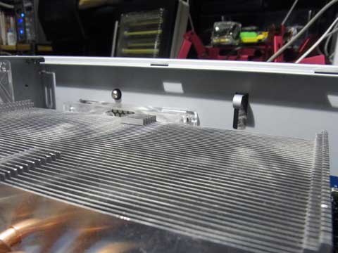 サイドパネルを想定した板を載せて、その隙間を計ってみると僅か1cm強。P183のサイドパネルは若干内側に張り出している部分もあるので、1cmを切る箇所もあるでしょう。これではファンがまともに吸気せず、使い物になりません。