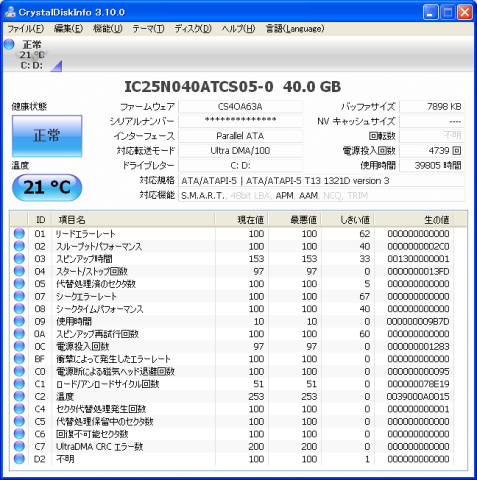 HDDは最初から入っているHITACHI製IC25N040ATCS05-0で,いまだに元気。