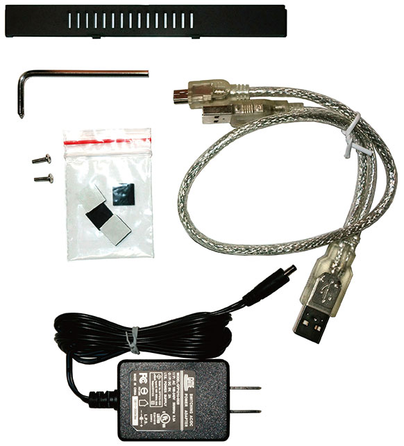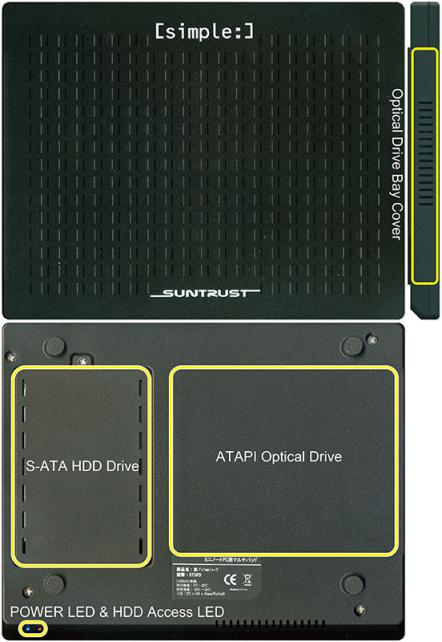 パッケージには、本体以外に、ACアダプター,USB 2.0ケーブル,光学ドライブ止めねじ,ゴム足,光学ドライブ取付口カバー(光学ドライブをつけない場合の目隠しフタ),説明書が付属していました。
