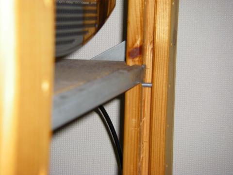 棚板は側面の穴から入れた固定金具に引っ掛けて固定。ちなみに、この固定金具を入れる溝は結構深いので、下のようにケーブルを隠蔽して配線する事が可能で、多少ですがケーブルの整理が出来ます。あと、木材なのでネジを打ち込んでモノを固定する事も可能。私はDVI切替機 ハイパーツールズ Game Switch PS3-S201AとICカードリーダー NTT-ME SCR3310-NTTComを棚板3枚目の下面に固定しています。