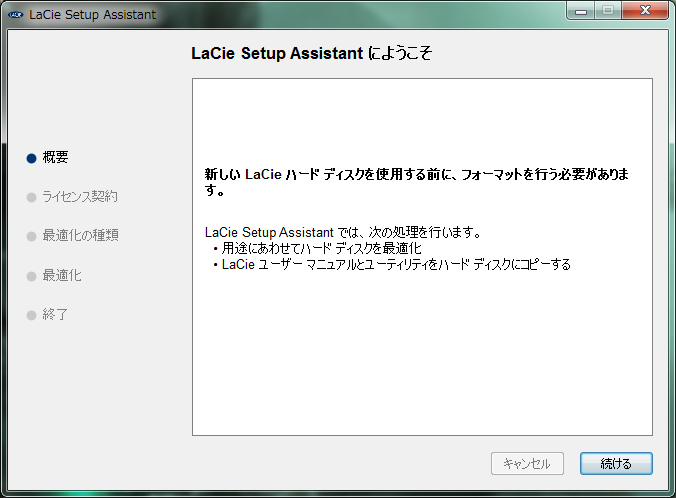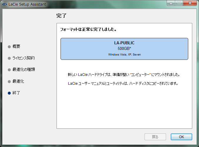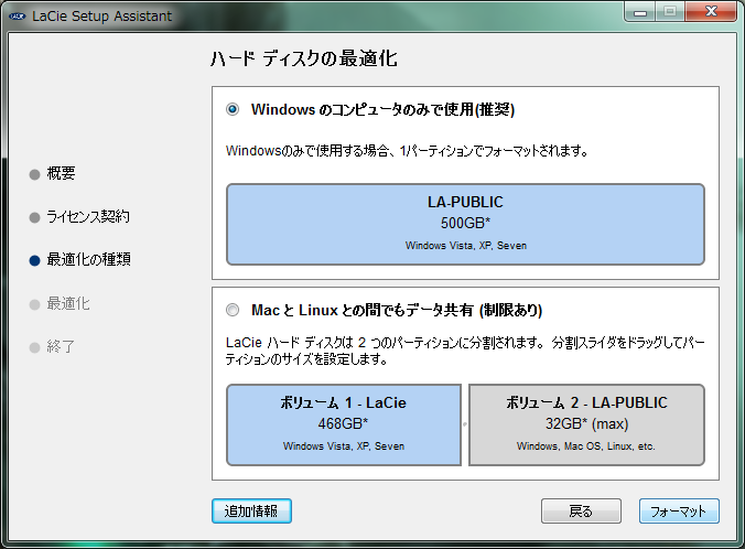 Macメインの会社だったらしく、いずれも形式選択が最初に来ます。また入ってる“LaCie Desktop Manager”などのソフトが多少クセがありますね(前回のと違う容量のを繋ぐとフォーマットがデフォルトの動作になる、など)。愛生さん