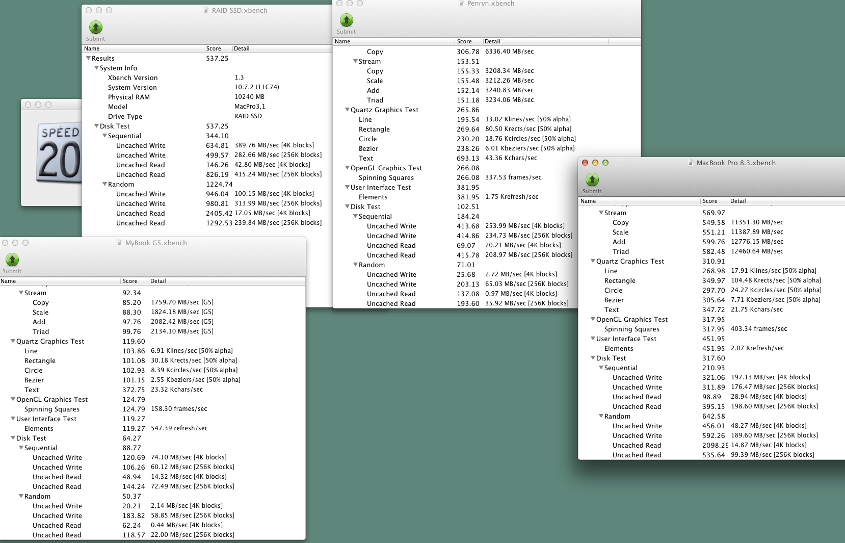 左下はFireWire 800接続の外付けRAID Disk。これはG5(2 GB Dual)に接続した数値です。当然Mac Proの起動ディスクより劣りますが,体感的にはどっちも「遅いなぁ……」で,大差ありません。