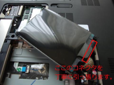 HDDを取り外して、SSDをそのケースに入れて、4つのねじを締めたら、先ほどと同じ要領で、パソコンに戻します。