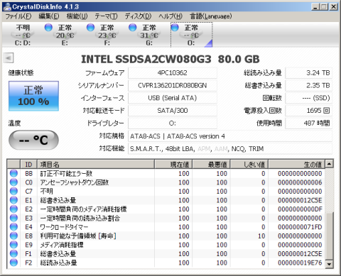 さしあたっての異常はなさそうですが、気になるのは電源投入回数の多さです。使用時間に対してもかなり多い印象があります。また、その割に総書き込み量、総読み込み量は大したレベルではなく、どのような使われ方をしていたのか少々気になるところです。
