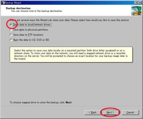 今回は、外付けHDDにバックアップするので、save data to local/network drivesを選択します