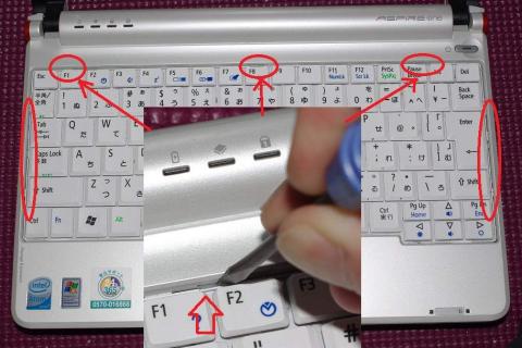 キーボードを固定しているツメをマイナスドライバー等で押し込みます
