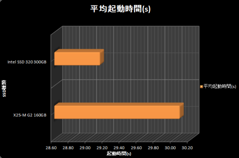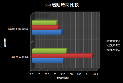 お次は、「Intel SSD 320 300GB」と「X25-M G2 160GB」の起動時間の比較を行いました。
