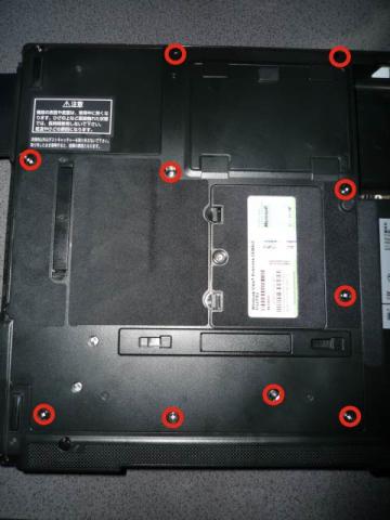 赤い丸印の10本が該当のねじです。HDDのユーザー側での交換は余り考慮されていないのかちょっと大がかりになります。