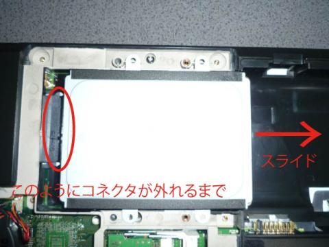 HDDトレイを軽く持ちながらゆっくりと右方向(バッテリースペース側)にずらし、コネクターを傷めないように静かに取り外します。