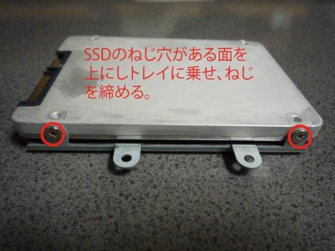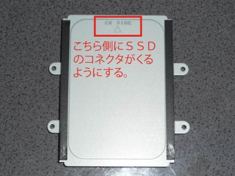 SSDのコネクタがトレイのCN SIDEと書かれた方に、ラベルの貼ってある面をトレイ側に来るように載せ、両側面のねじを取り付けます。トレイをひっくりがした場合は上側にラベルが無く平らな面が来るように置きます。