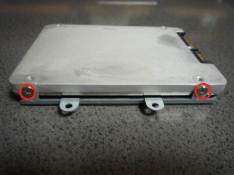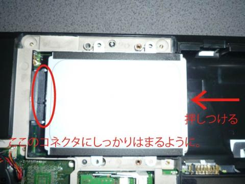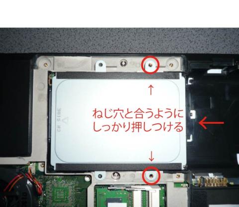 また、HDDとの厚さ比較をした時の微妙な差によってねじ穴が少しずれているので、ちょっと強めに押しつけ、ねじ穴と合うようにしながらねじを取り付けます。