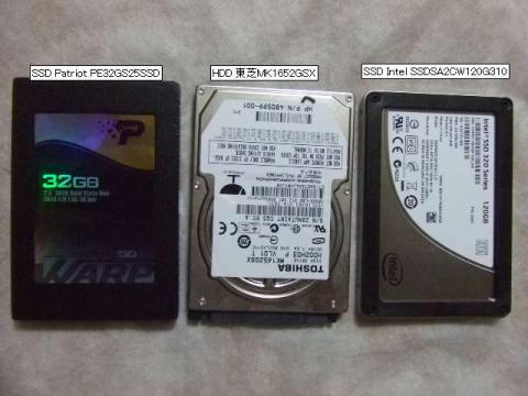 外したHD、レビュー用のIntelSSD、3年程前のSSD(PATRIOTのWARP)を並べてみました。