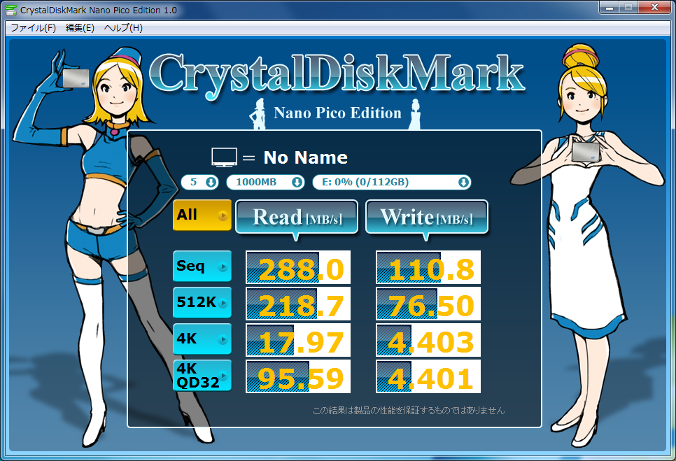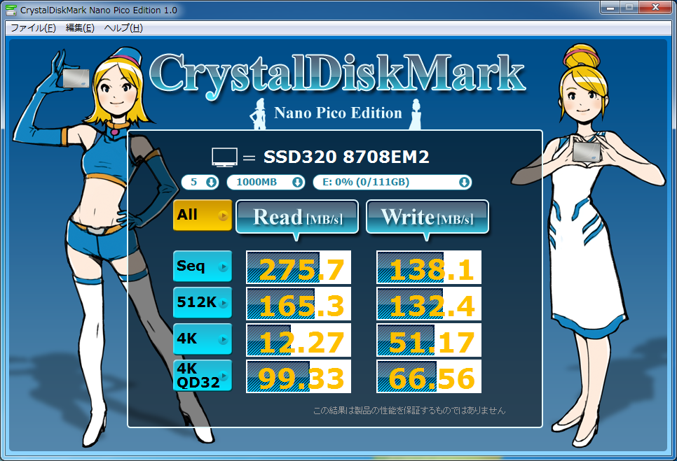 キャッシュメモリが効く100MBではかなりの速度を叩き出していますが、キャッシュメモリが無効になる1000MBにおいても、シーケンシャルリード276MB/s、ライト138MB/sと極めて高速な値を叩き出しています。
