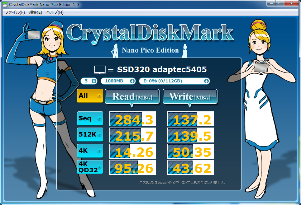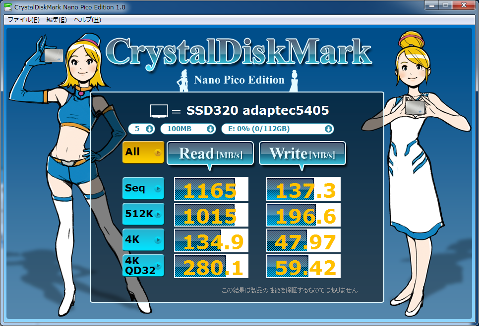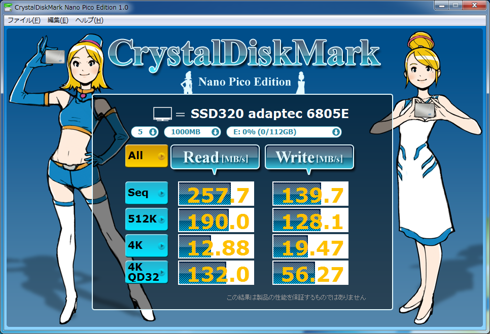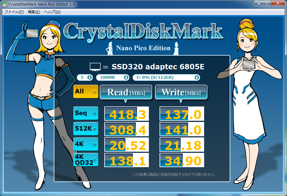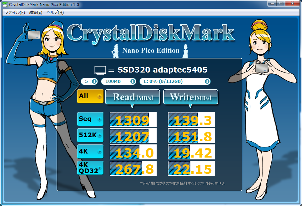 キャッシュメモリが有効になっている状態でもAdaptec SAS 5405には敵いませんので、SAS/SATA 2.0のデバイスで使う限りは、あまりメリットが見いだしにくいカードと言えます。